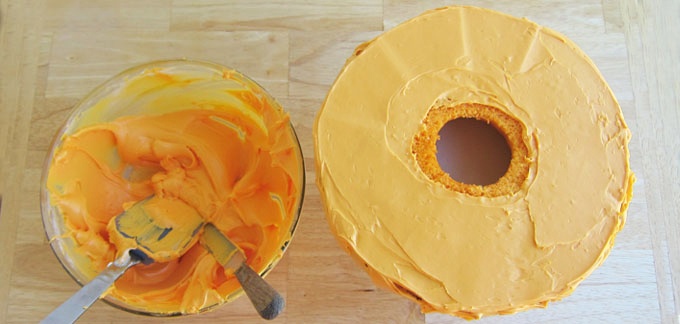 Шаг 9. Покройте второй кекс кремом. Затем, используя шпатель, сформируйте полосы на тыкве, проводя шпателем от основания торта к его верхушке.